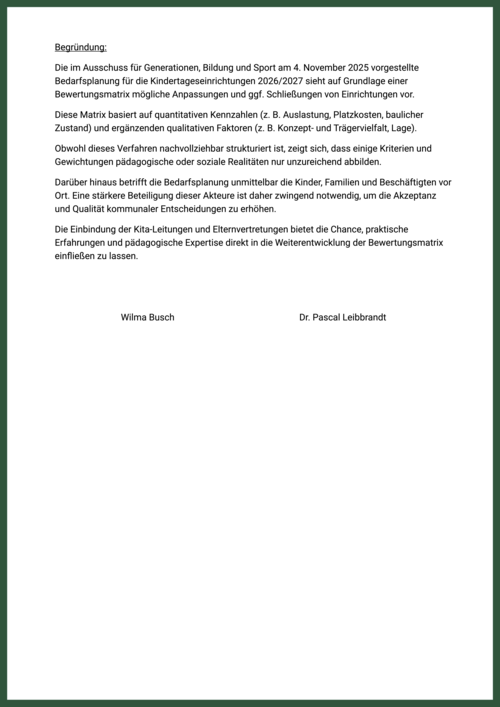 Kitaschließungen sind auf Grundlage dieser intransparenten Bewertungsmatrix und ohne Beteiligung der betroffenen Menschen nicht akzeptabel. Mit unserem Antrag fordern wir einen transparenten Prozess mit Beteiligung der Eltern, Kita-Leitung und der Träger.