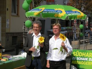 Übrigens dürfte der Straßenwahlkampf den Grünen Sonnenblumen eines ganzen Anbaufeldes gekostet haben. Und auch die großen Kuchenbleche leerten sich während ihrer Gespräche mit den Bürgern zusehens bis auf kleine Reste. Man versorgte seine Interessenten also nicht nur mit Informationen.